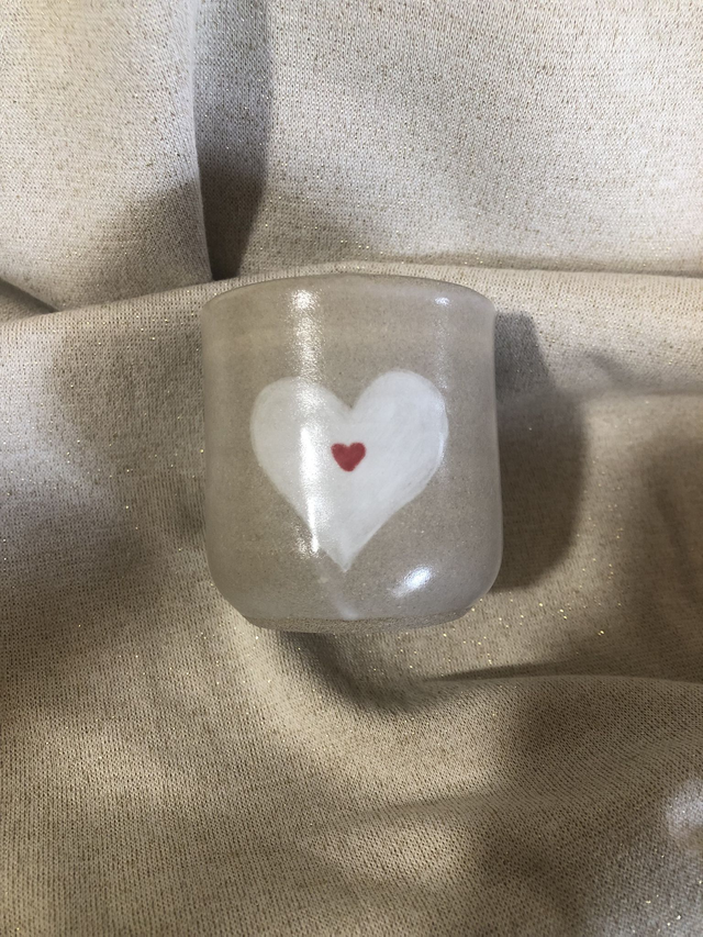 Tasse réalisée en grès Toffee , le coeur engobé en blanc et rouge suivi d'un émail transparent