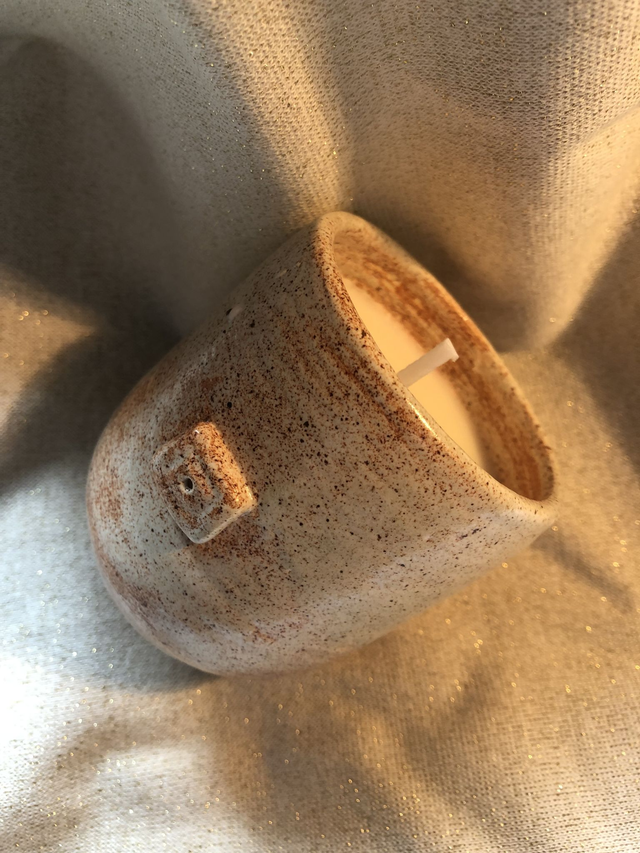 Bougie fait au tour avec une terre en grès blanc, émaillage intérieur et extérieur "crème mouchetée". Aux huiles essentielles 100% pure et naturelle, parfum vanille, mèche en coton pré-ciré à la cire de soja naturelle sans OGM. La fabrication des pièces est faite avec le plus grand soin, toutefois, elles peuvent présenter de légères imperfections ( formes, couleurs,) , cela fait partie de l'authenticité de l'artisanat.